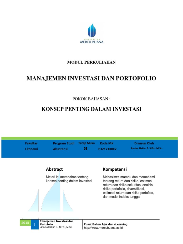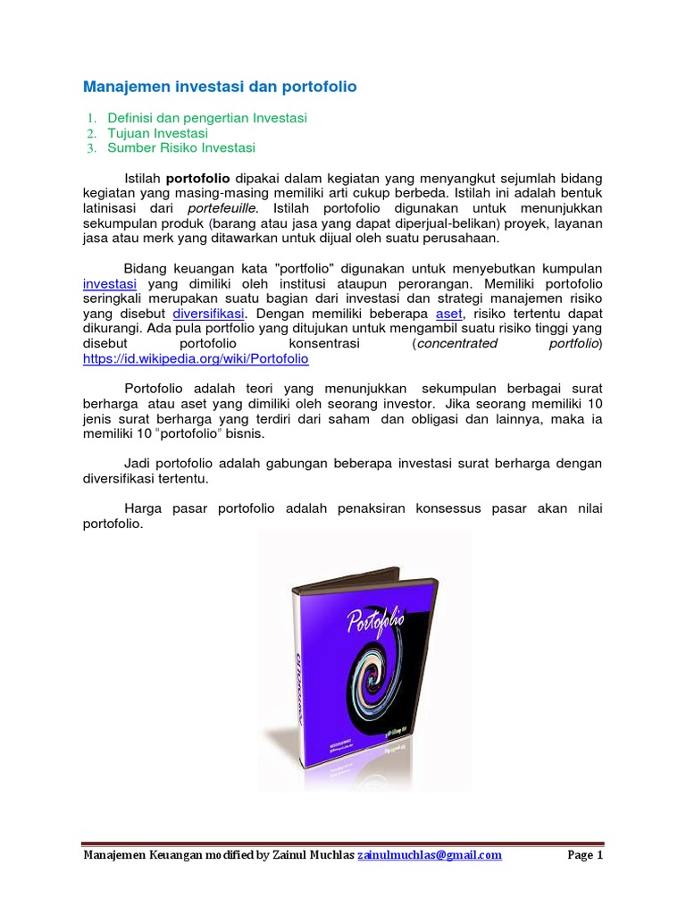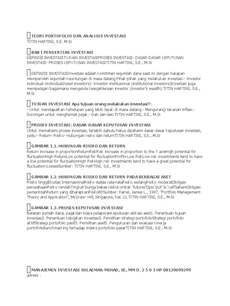 Manajemen investasi dan portofolio pdf. Manajemen_Investasi_and_Portofolio.pdf - Manajemen ... View Manajemen_Investasi_and_Portofolio.pdf from AKUNTANSI 8.4 at Airlangga University. Manajemen Investasi dan Portofolio BAB I TEORI PORTOFOLIO 1.1 PENDAHULUAN Pemilihan bentuk atau jenis kekayaan › 49928115 › buku_Manajemen(PDF) buku Manajemen Investasi dan Teori Portofolio | Dayan ... berisi 18 modul bahan ajar untuk matakuliah Manajemen Investasi dan Teori Portofolio ebookage.com › pdf › manajemen-investasi-dan-portofolio[PDF] manajemen investasi dan portofolio Full Book Format: PDF, ePub, Mobi Category : Business & Economics Languages : id Pages : 75 View: 805. Get Book. Book Description Karya ini membahas mengenai pengambilan keputusan investasi dengan mempetimbangkan berbagai faktor eksternal dan faktor internal dan bagaimana cara menyusun, menilai, menganalisis resiko dan menghitung keuntungan dari ... Manajemen Portofolio: Pengertian, Tujuan, dan Prosesnya ... Pengertian Manajemen Portofolio. Pengertian manajemen portofolio adalah proses terintegrasi yang terdiri atas gabungan beberapa langkah yang diimplementasikan secara konsisten untuk membuat dan mengelola portofolio aset untuk mencapai tujuan tertentu dari seorang investor.. Untuk menghasilkan manajemen portofolio yang baik, maka diperlukan adanya perpaduan aset investasi yang tepat sambil ...