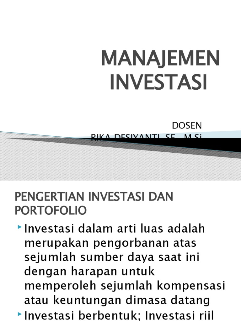 Manajemen Investasi: Pengertian dan Cara Kerjanya [Terlengkap] Manajemen investasi adalah sebuah proses yang dilakukan untuk membangun portofolio investasi, seperti saham, obligasi, dan instrumen lainnya sesuai dengan tujuan yang diinginkan. Manajemen investasi juga bisa disebut sebagai layanan keuangan yang memberikan konsultasi berupa strategi investasi pada seseorang, seperti cara membeli dan menjual ...