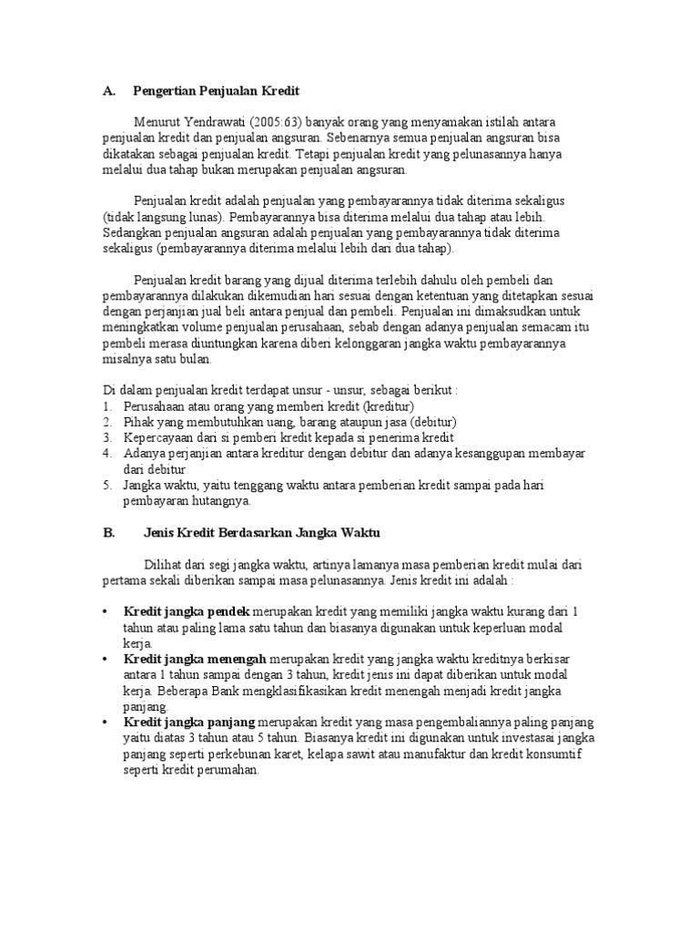 Jelaskan Yang Dimaksud Dengan Penjualan Kredit? (Question ... Penjualan kredit merupakan jenis penjualan yang pembayarannya dilakukan dengan cara dicicil dalam rentan waktu tertentu. Jumlah cicilannya disesuaikan dengan berapa lama kredit yang diambil.. Penjualan kredit adalah penjualan yang dilakukan secara non-tunai.Dalam hal ini laba yang diharapkan adalah lebih besar daripada penjualan tunai.