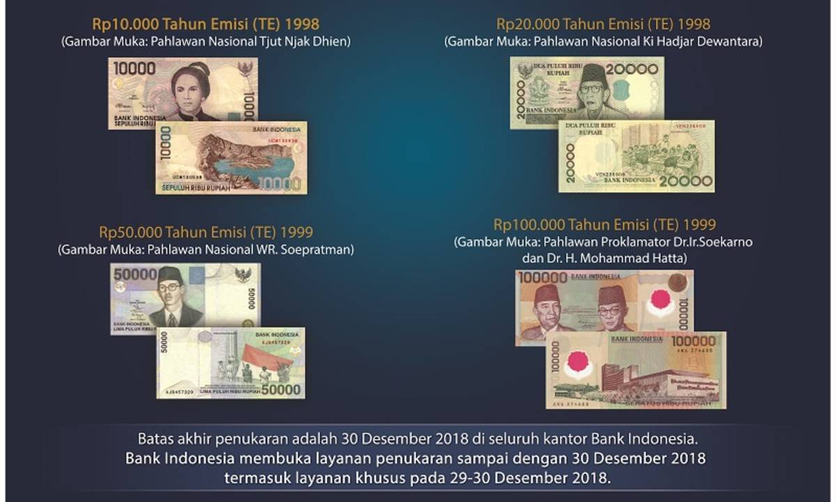Cara Tukar Uang Kadaluwarsa Emisi 1998 dan 1999 di Bank ... - Cermati Tukar 4 Uang Kertas Rupiah Ini hingga 30 Desember 2018 via bi.go.id. Nah tahun ini adalah tahun terakhir penukaran 4 uang rupiah emisi lama 1998 dan 1999. Berdasarkan data BI, 4 pecahan uang kertas rupiah yang masih bisa ditukarkan masyarakat sampai tanggal 30 Desember 2018, antara lain: 1. Uang pecahan Rp10.000 Tahun Emisi 1998.