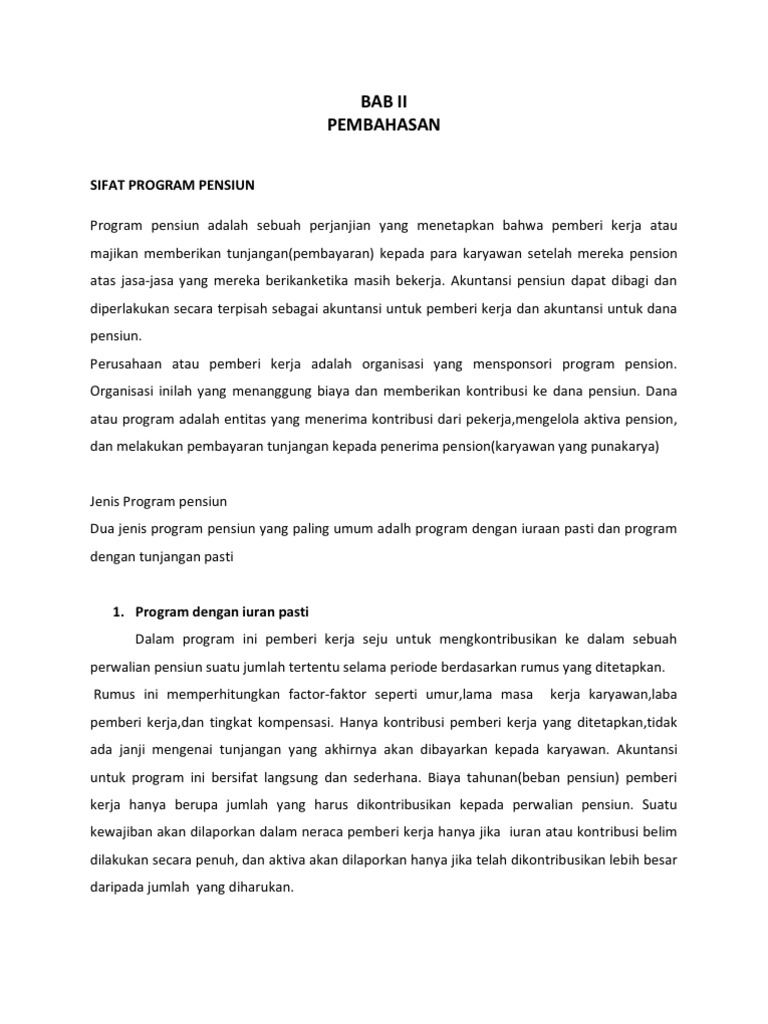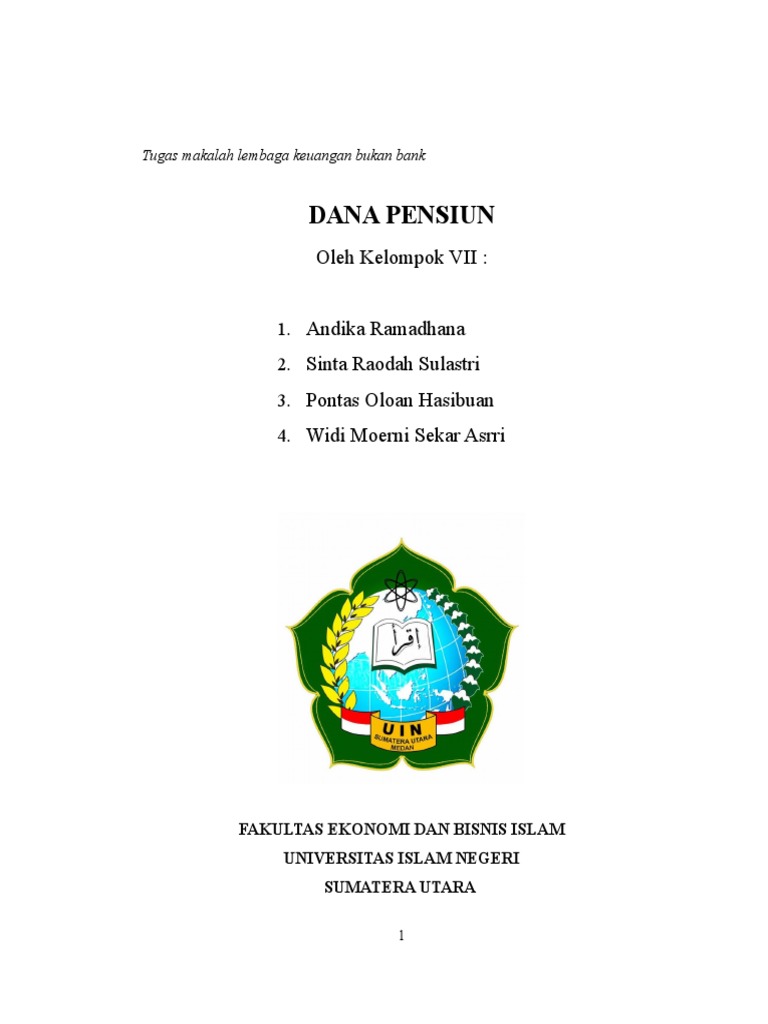 BLOGGER FLASHJR: Makalah Tentang Dana Pensiun Makalah Tentang Dana Pensiun KATA PENGANTAR Puji syukur kami panjatkan kehadirat Allah SWT yang telah melimpahkan rahmat, taufik, serta hidayah-Nya sehingga kami dapat menyusun Tugas Ekonomi ini dengan baik dan tepat waktu. Tugas ini kami buat untuk memberikan penjelasan tentang Dana Pensiun. Makalah Dana Pensiun Syariah.docx - DANA PENSIUN SYARIAH ... Kegiatan perusahaan dana pensiun adalah memungut dana dari iuran yang dipotong dari pendapatan karyawan suatu perusahaan. Iuran ini kemudian diinvestasikan lagi ke dalam berbagai kegiatan usaha yang dianggap paling menguntungkan. Bagi perusahaan dana pensiun, iuran yang dipunguti dari karyawan suatu perusahaan tidak dikenakan pajak.